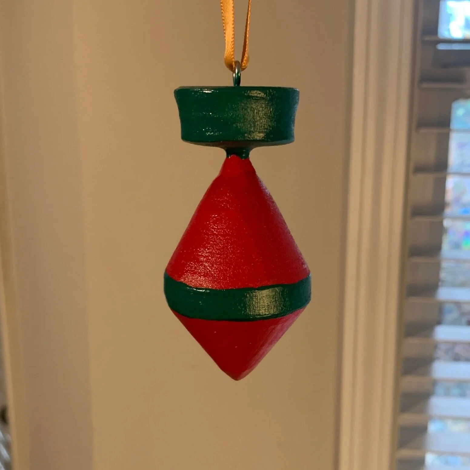 A fun, red and green, diamond-shaped Christmas ornament, 100% handmade from high-quality poplar wood. Julie turns her ornaments on the lathe, and then applies paint and/or a long-lasting wood finish. Every ornament is unique!