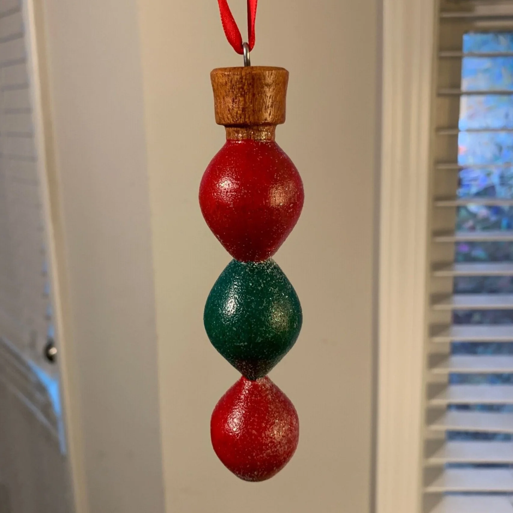 A festive, red and green Christmas ornament with glitter, 100% handmade from high-quality mahogany wood. Julie turns her ornaments on the lathe, and then applies paint and/or a long-lasting wood finish. Every ornament is unique!